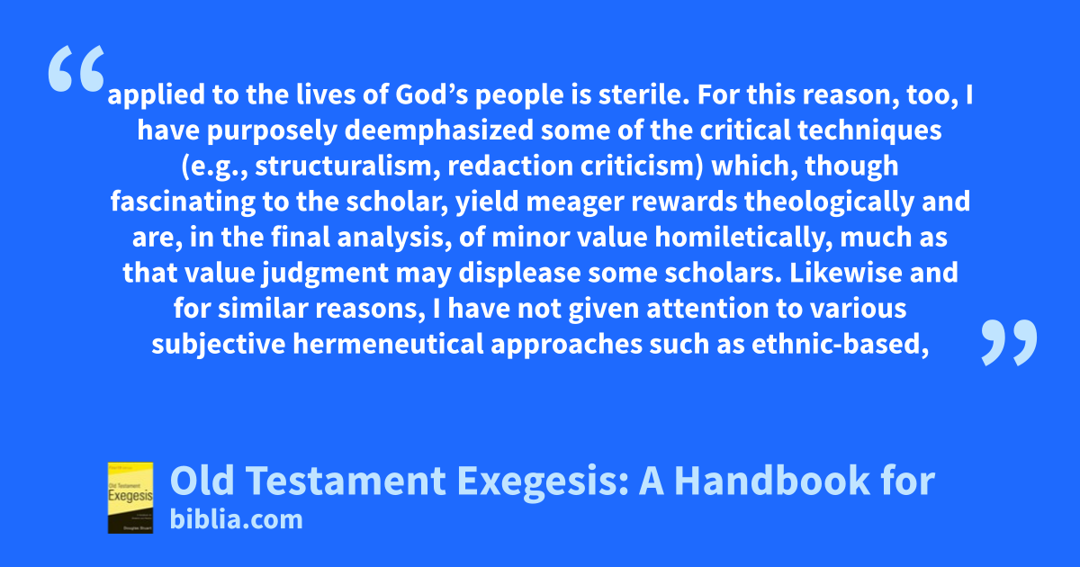 applied to the lives of God’s people is sterile. For this reason, too, I have purposely deemphasized some of the critical techniques (e.g., structuralism, redaction criticism) which, though fascinating to the scholar, yield meager rewards theologically and are, in the final analysis, of minor value homiletically, much as that value judgment may displease some scholars. Likewise and for similar reasons, I have not given attention to various subjective hermeneutical approaches such as ethnic-based,