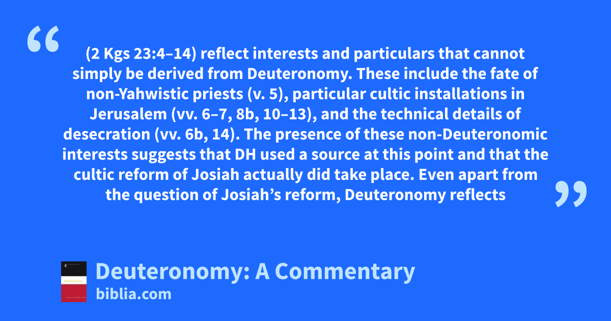 (2 Kgs 23:4–14) reflect interests and particulars that cannot simply be derived from Deuteronomy. These include the fate of non-Yahwistic priests (v. 5), particular cultic installations in Jerusalem (vv. 6–7, 8b, 10–13), and the technical details of desecration (vv. 6b, 14). The presence of these non-Deuteronomic interests suggests that DH used a source at this point and that the cultic reform of Josiah actually did take place. Even apart from the question of Josiah’s reform, Deuteronomy reflects
