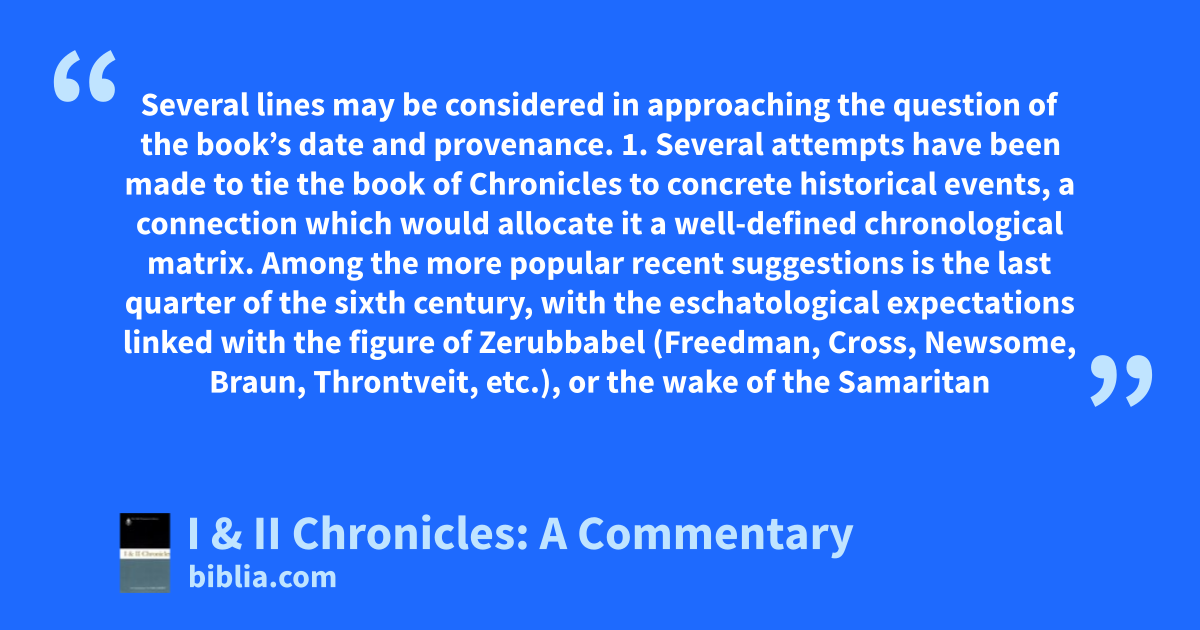 Several lines may be considered in approaching the question of the book’s date and provenance. 1. Several attempts have been made to tie the book of Chronicles to concrete historical events, a connection which would allocate it a well-defined chronological matrix. Among the more popular recent suggestions is the last quarter of the sixth century, with the eschatological expectations linked with the figure of Zerubbabel (Freedman, Cross, Newsome, Braun, Throntveit, etc.), or the wake of the Samaritan