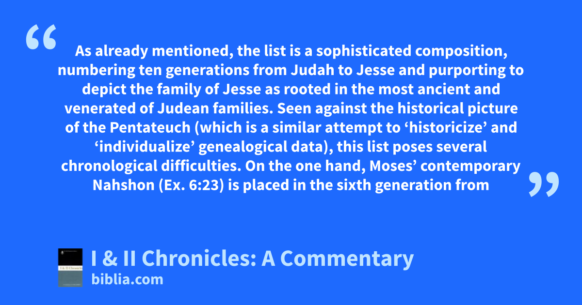 As already mentioned, the list is a sophisticated composition, numbering ten generations from Judah to Jesse and purporting to depict the family of Jesse as rooted in the most ancient and venerated of Judean families. Seen against the historical picture of the Pentateuch (which is a similar attempt to ‘historicize’ and ‘individualize’ genealogical data), this list poses several chronological difficulties. On the one hand, Moses’ contemporary Nahshon (Ex. 6:23) is placed in the sixth generation from