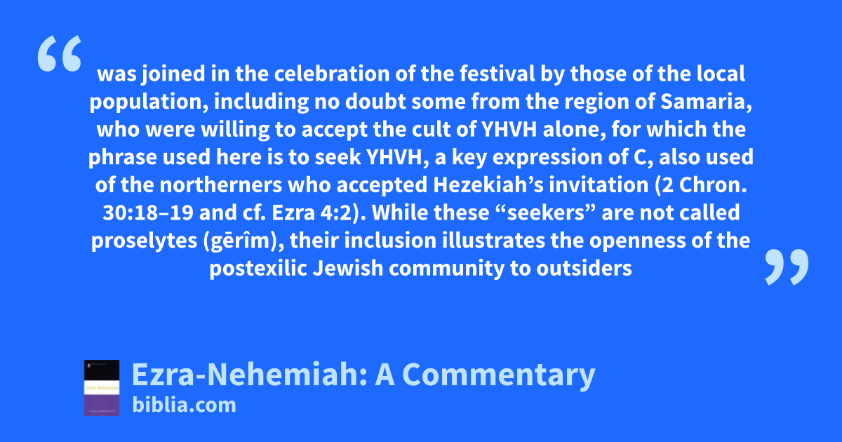 was joined in the celebration of the festival by those of the local population, including no doubt some from the region of Samaria, who were willing to accept the cult of YHVH alone, for which the phrase used here is to seek YHVH, a key expression of C, also used of the northerners who accepted Hezekiah’s invitation (2 Chron. 30:18–19 and cf. Ezra 4:2). While these “seekers” are not called proselytes (gērîm), their inclusion illustrates the openness of the postexilic Jewish community to outsiders