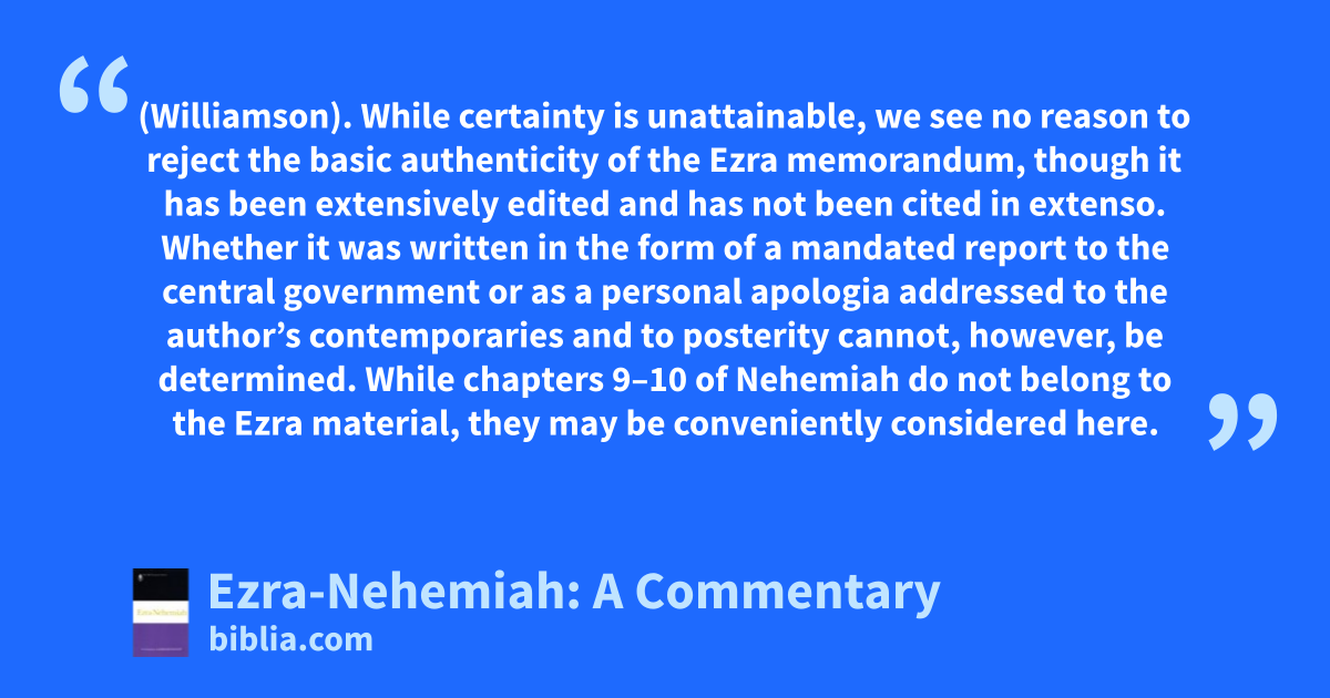 (Williamson). While certainty is unattainable, we see no reason to reject the basic authenticity of the Ezra memorandum, though it has been extensively edited and has not been cited in extenso. Whether it was written in the form of a mandated report to the central government or as a personal apologia addressed to the author’s contemporaries and to posterity cannot, however, be determined. While chapters 9–10 of Nehemiah do not belong to the Ezra material, they may be conveniently considered here.