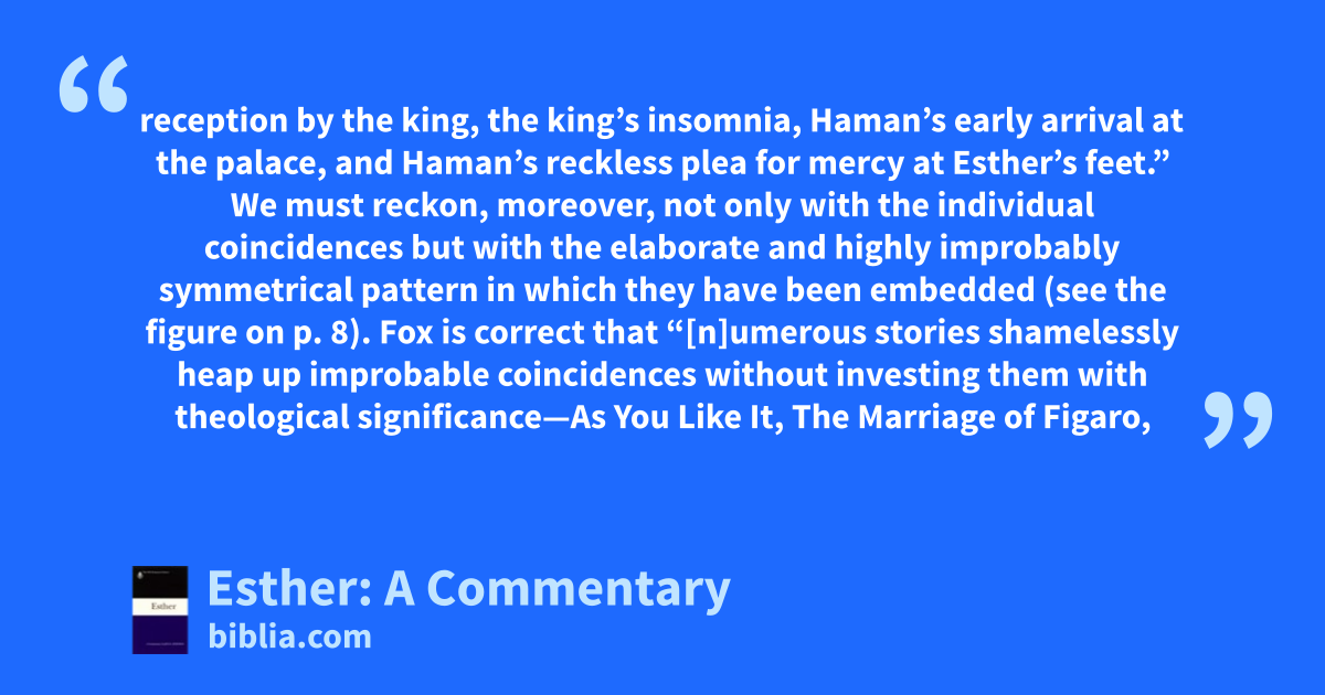 reception by the king, the king’s insomnia, Haman’s early arrival at the palace, and Haman’s reckless plea for mercy at Esther’s feet.” We must reckon, moreover, not only with the individual coincidences but with the elaborate and highly improbably symmetrical pattern in which they have been embedded (see the figure on p. 8). Fox is correct that “[n]umerous stories shamelessly heap up improbable coincidences without investing them with theological significance—As You Like It, The Marriage of Figaro,