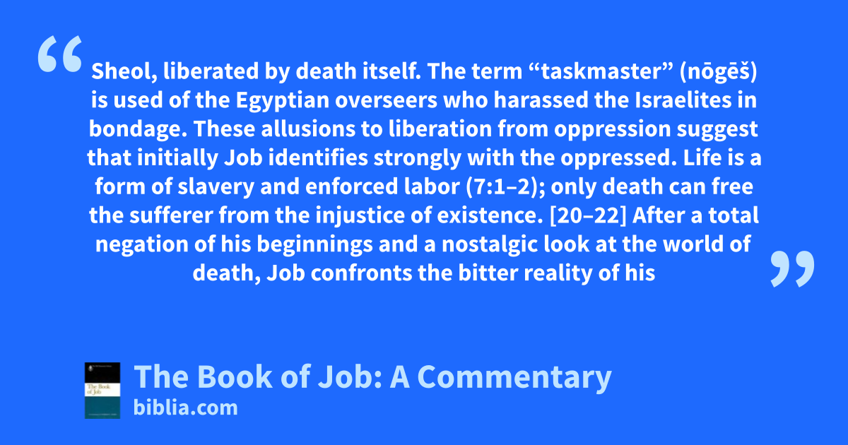 Sheol, liberated by death itself. The term “taskmaster” (nōgēš) is used of the Egyptian overseers who harassed the Israelites in bondage. These allusions to liberation from oppression suggest that initially Job identifies strongly with the oppressed. Life is a form of slavery and enforced labor (7:1–2); only death can free the sufferer from the injustice of existence. [20–22] After a total negation of his beginnings and a nostalgic look at the world of death, Job confronts the bitter reality of his
