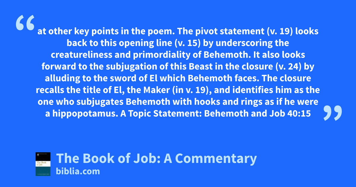 at other key points in the poem. The pivot statement (v. 19) looks back to this opening line (v. 15) by underscoring the creatureliness and primordiality of Behemoth. It also looks forward to the subjugation of this Beast in the closure (v. 24) by alluding to the sword of El which Behemoth faces. The closure recalls the title of El, the Maker (in v. 19), and identifies him as the one who subjugates Behemoth with hooks and rings as if he were a hippopotamus. A Topic Statement: Behemoth and Job 40:15