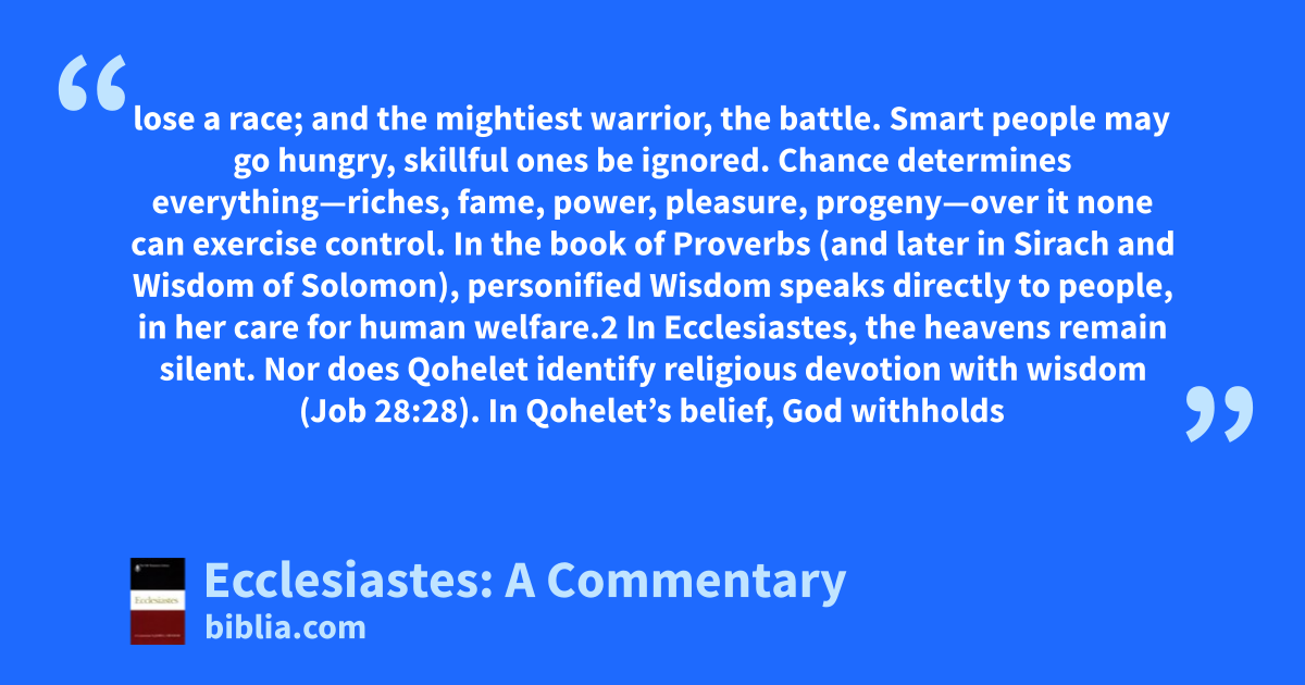 lose a race; and the mightiest warrior, the battle. Smart people may go hungry, skillful ones be ignored. Chance determines everything—riches, fame, power, pleasure, progeny—over it none can exercise control. In the book of Proverbs (and later in Sirach and Wisdom of Solomon), personified Wisdom speaks directly to people, in her care for human welfare.2 In Ecclesiastes, the heavens remain silent. Nor does Qohelet identify religious devotion with wisdom (Job 28:28). In Qohelet’s belief, God withholds