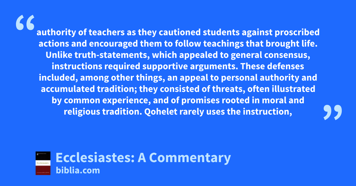 authority of teachers as they cautioned students against proscribed actions and encouraged them to follow teachings that brought life. Unlike truth-statements, which appealed to general consensus, instructions required supportive arguments. These defenses included, among other things, an appeal to personal authority and accumulated tradition; they consisted of threats, often illustrated by common experience, and of promises rooted in moral and religious tradition. Qohelet rarely uses the instruction,