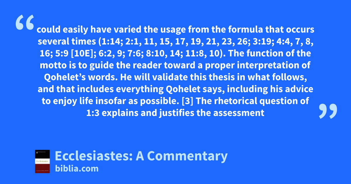 could easily have varied the usage from the formula that occurs several times (1:14; 2:1, 11, 15, 17, 19, 21, 23, 26; 3:19; 4:4, 7, 8, 16; 5:9 [10E]; 6:2, 9; 7:6; 8:10, 14; 11:8, 10). The function of the motto is to guide the reader toward a proper interpretation of Qohelet’s words. He will validate this thesis in what follows, and that includes everything Qohelet says, including his advice to enjoy life insofar as possible. [3] The rhetorical question of 1:3 explains and justifies the assessment