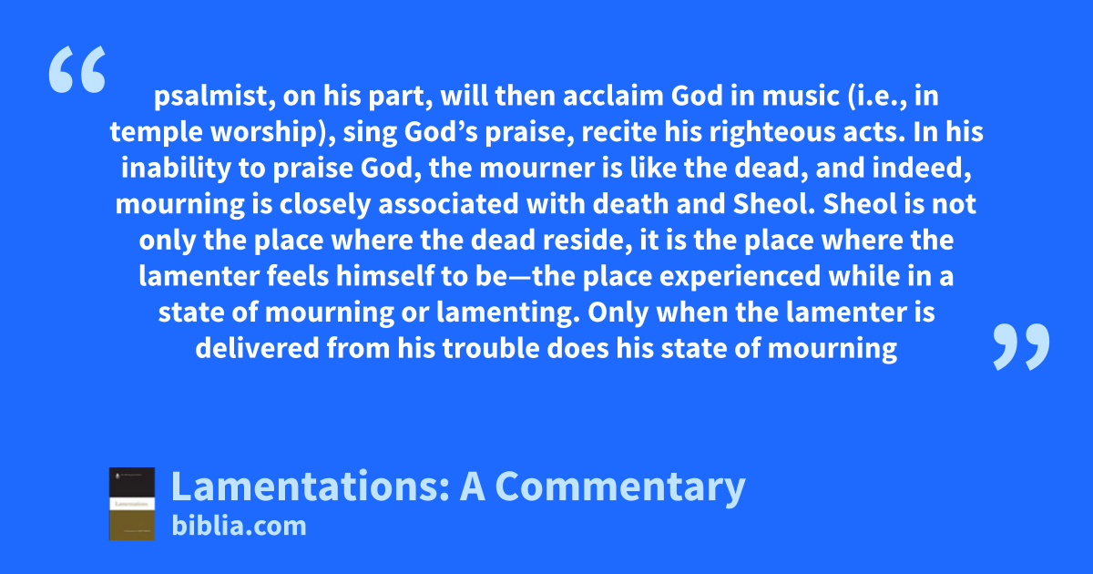 psalmist, on his part, will then acclaim God in music (i.e., in temple worship), sing God’s praise, recite his righteous acts. In his inability to praise God, the mourner is like the dead, and indeed, mourning is closely associated with death and Sheol. Sheol is not only the place where the dead reside, it is the place where the lamenter feels himself to be—the place experienced while in a state of mourning or lamenting. Only when the lamenter is delivered from his trouble does his state of mourning