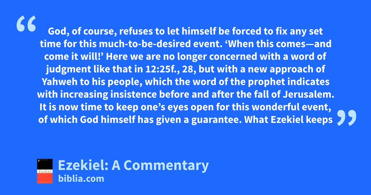 God, of course, refuses to let himself be forced to fix any set time for this much-to-be-desired event. ‘When this comes—and come it will!’ Here we are no longer concerned with a word of judgment like that in 12:25f., 28, but with a new approach of Yahweh to his people, which the word of the prophet indicates with increasing insistence before and after the fall of Jerusalem. It is now time to keep one’s eyes open for this wonderful event, of which God himself has given a guarantee. What Ezekiel keeps