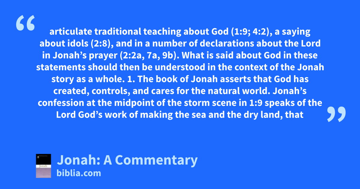 articulate traditional teaching about God (1:9; 4:2), a saying about idols (2:8), and in a number of declarations about the Lord in Jonah’s prayer (2:2a, 7a, 9b). What is said about God in these statements should then be understood in the context of the Jonah story as a whole. 1. The book of Jonah asserts that God has created, controls, and cares for the natural world. Jonah’s confession at the midpoint of the storm scene in 1:9 speaks of the Lord God’s work of making the sea and the dry land, that