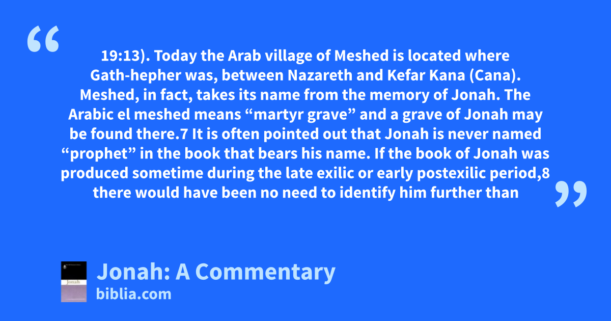 19:13). Today the Arab village of Meshed is located where Gath-hepher was, between Nazareth and Kefar Kana (Cana). Meshed, in fact, takes its name from the memory of Jonah. The Arabic el meshed means “martyr grave” and a grave of Jonah may be found there.7 It is often pointed out that Jonah is never named “prophet” in the book that bears his name. If the book of Jonah was produced sometime during the late exilic or early postexilic period,8 there would have been no need to identify him further than
