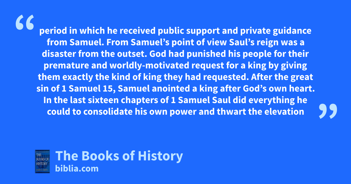 period in which he received public support and private guidance from Samuel. From Samuel’s point of view Saul’s reign was a disaster from the outset. God had punished his people for their premature and worldly-motivated request for a king by giving them exactly the kind of king they had requested. After the great sin of 1 Samuel 15, Samuel anointed a king after God’s own heart. In the last sixteen chapters of 1 Samuel Saul did everything he could to consolidate his own power and thwart the elevation