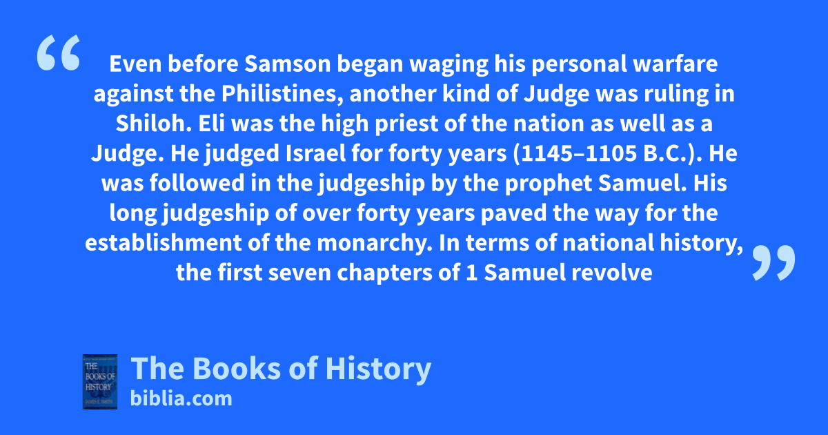 Even before Samson began waging his personal warfare against the Philistines, another kind of Judge was ruling in Shiloh. Eli was the high priest of the nation as well as a Judge. He judged Israel for forty years (1145–1105 B.C.). He was followed in the judgeship by the prophet Samuel. His long judgeship of over forty years paved the way for the establishment of the monarchy. In terms of national history, the first seven chapters of 1 Samuel revolve