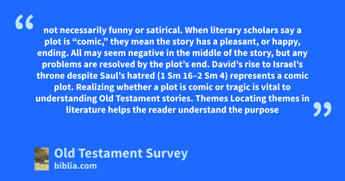not necessarily funny or satirical. When literary scholars say a plot is “comic,” they mean the story has a pleasant, or happy, ending. All may seem negative in the middle of the story, but any problems are resolved by the plot’s end. David’s rise to Israel’s throne despite Saul’s hatred (1 Sm 16–2 Sm 4) represents a comic plot. Realizing whether a plot is comic or tragic is vital to understanding Old Testament stories. Themes Locating themes in literature helps the reader understand the purpose