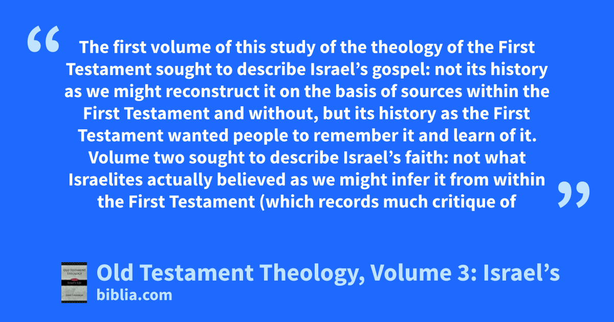 The first volume of this study of the theology of the First Testament sought to describe Israel’s gospel: not its history as we might reconstruct it on the basis of sources within the First Testament and without, but its history as the First Testament wanted people to remember it and learn of it. Volume two sought to describe Israel’s faith: not what Israelites actually believed as we might infer it from within the First Testament (which records much critique of