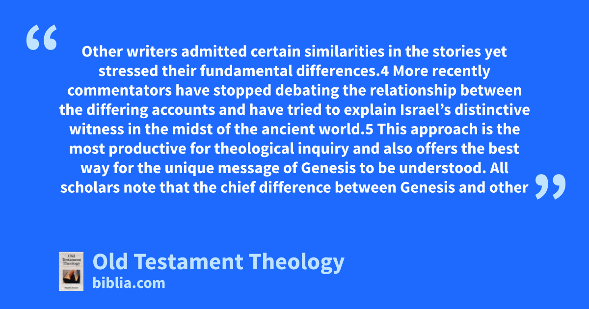 Other writers admitted certain similarities in the stories yet stressed their fundamental differences.4 More recently commentators have stopped debating the relationship between the differing accounts and have tried to explain Israel’s distinctive witness in the midst of the ancient world.5 This approach is the most productive for theological inquiry and also offers the best way for the unique message of Genesis to be understood. All scholars note that the chief difference between Genesis and other