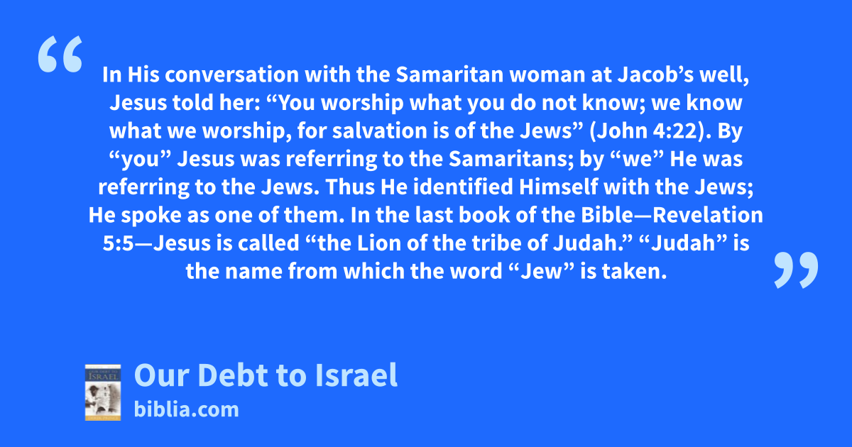 In His conversation with the Samaritan woman at Jacob’s well, Jesus told her: “You worship what you do not know; we know what we worship, for salvation is of the Jews” (John 4:22). By “you” Jesus was referring to the Samaritans; by “we” He was referring to the Jews. Thus He identified Himself with the Jews; He spoke as one of them. In the last book of the Bible—Revelation 5:5—Jesus is called “the Lion of the tribe of Judah.” “Judah” is the name from which the word “Jew” is taken.