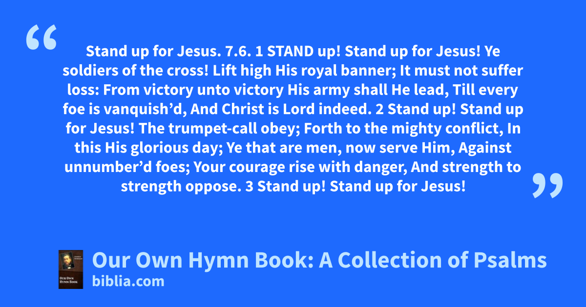 Stand up for Jesus. 7.6. 1 STAND up! Stand up for Jesus! Ye soldiers of the cross! Lift high His royal banner; It must not suffer loss: From victory unto victory His army shall He lead, Till every foe is vanquish’d, And Christ is Lord indeed. 2 Stand up! Stand up for Jesus! The trumpet-call obey; Forth to the mighty conflict, In this His glorious day; Ye that are men, now serve Him, Against unnumber’d foes; Your courage rise with danger, And strength to strength oppose. 3 Stand up! Stand up for Jesus!
