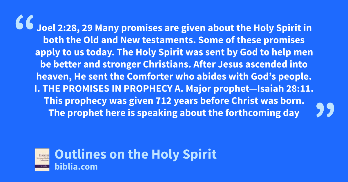 Joel 2:28, 29 Many promises are given about the Holy Spirit in both the Old and New testaments. Some of these promises apply to us today. The Holy Spirit was sent by God to help men be better and stronger Christians. After Jesus ascended into heaven, He sent the Comforter who abides with God’s people. I. THE PROMISES IN PROPHECY A. Major prophet—Isaiah 28:11. This prophecy was given 712 years before Christ was born. The prophet here is speaking about the forthcoming day