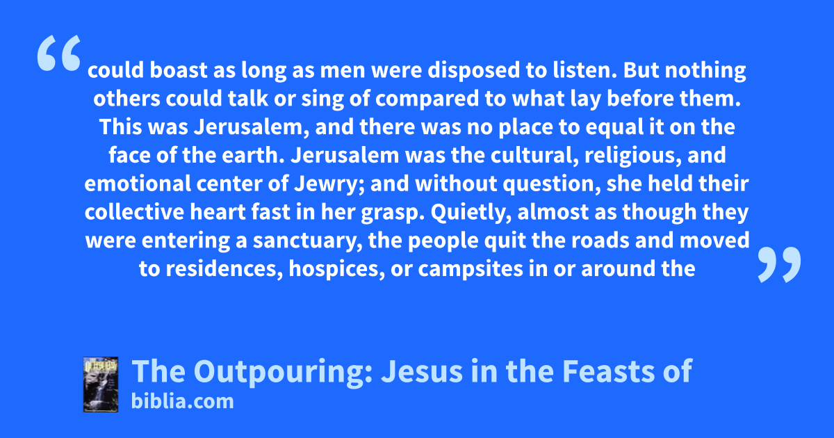 could boast as long as men were disposed to listen. But nothing others could talk or sing of compared to what lay before them. This was Jerusalem, and there was no place to equal it on the face of the earth. Jerusalem was the cultural, religious, and emotional center of Jewry; and without question, she held their collective heart fast in her grasp. Quietly, almost as though they were entering a sanctuary, the people quit the roads and moved to residences, hospices, or campsites in or around the