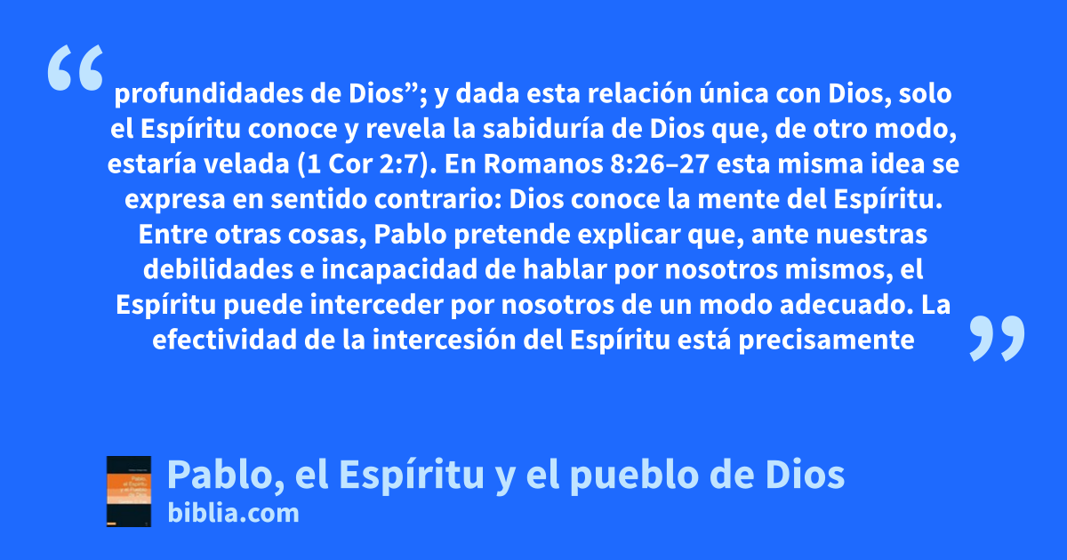 profundidades de Dios”; y dada esta relación única con Dios, solo el Espíritu conoce y revela la sabiduría de Dios que, de otro modo, estaría velada (1 Cor 2:7). En Romanos 8:26–27 esta misma idea se expresa en sentido contrario: Dios conoce la mente del Espíritu. Entre otras cosas, Pablo pretende explicar que, ante nuestras debilidades e incapacidad de hablar por nosotros mismos, el Espíritu puede interceder por nosotros de un modo adecuado. La efectividad de la intercesión del Espíritu está precisamente