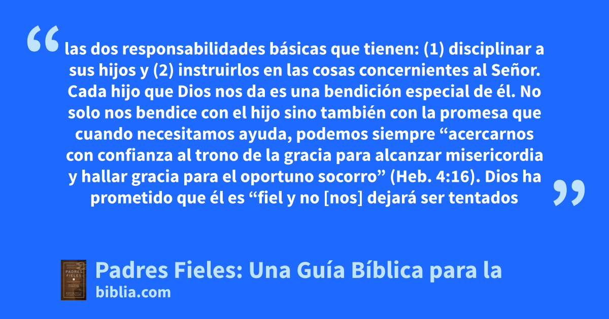 las dos responsabilidades básicas que tienen: (1) disciplinar a sus hijos y (2) instruirlos en las cosas concernientes al Señor. Cada hijo que Dios nos da es una bendición especial de él. No solo nos bendice con el hijo sino también con la promesa que cuando necesitamos ayuda, podemos siempre “acercarnos con confianza al trono de la gracia para alcanzar misericordia y hallar gracia para el oportuno socorro” (Heb. 4:16). Dios ha prometido que él es “fiel y no [nos] dejará ser tentados