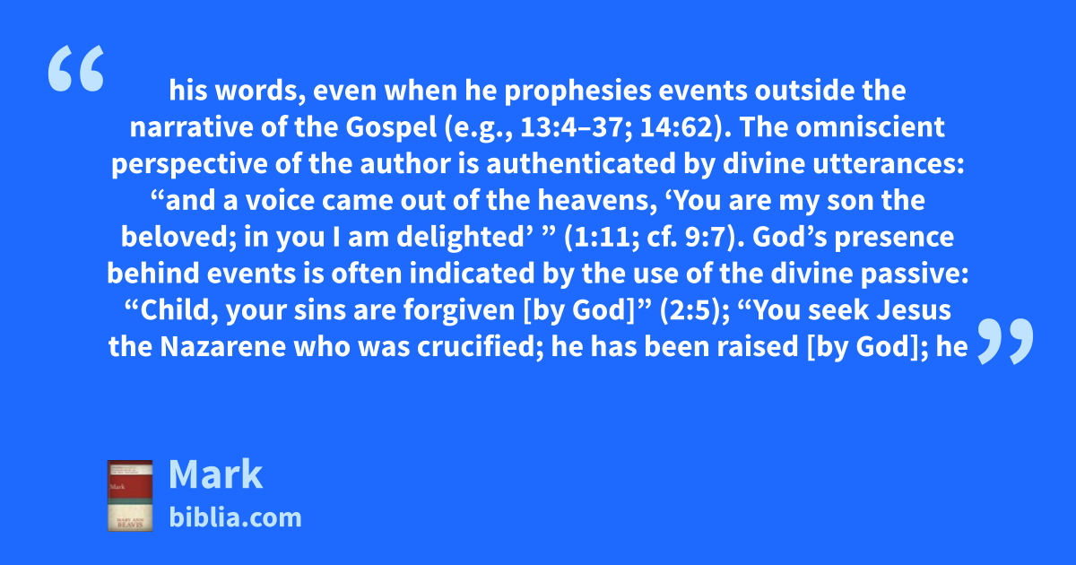 his words, even when he prophesies events outside the narrative of the Gospel (e.g., 13:4–37; 14:62). The omniscient perspective of the author is authenticated by divine utterances: “and a voice came out of the heavens, ‘You are my son the beloved; in you I am delighted’ ” (1:11; cf. 9:7). God’s presence behind events is often indicated by the use of the divine passive: “Child, your sins are forgiven [by God]” (2:5); “You seek Jesus the Nazarene who was crucified; he has been raised [by God]; he