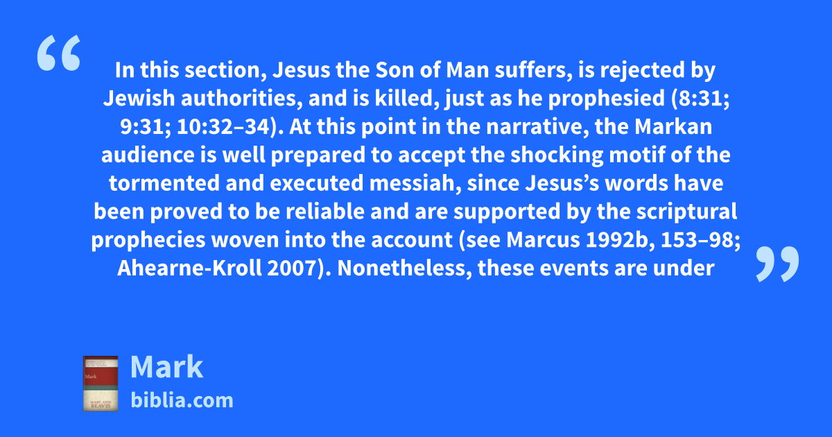In this section, Jesus the Son of Man suffers, is rejected by Jewish authorities, and is killed, just as he prophesied (8:31; 9:31; 10:32–34). At this point in the narrative, the Markan audience is well prepared to accept the shocking motif of the tormented and executed messiah, since Jesus’s words have been proved to be reliable and are supported by the scriptural prophecies woven into the account (see Marcus 1992b, 153–98; Ahearne-Kroll 2007). Nonetheless, these events are under