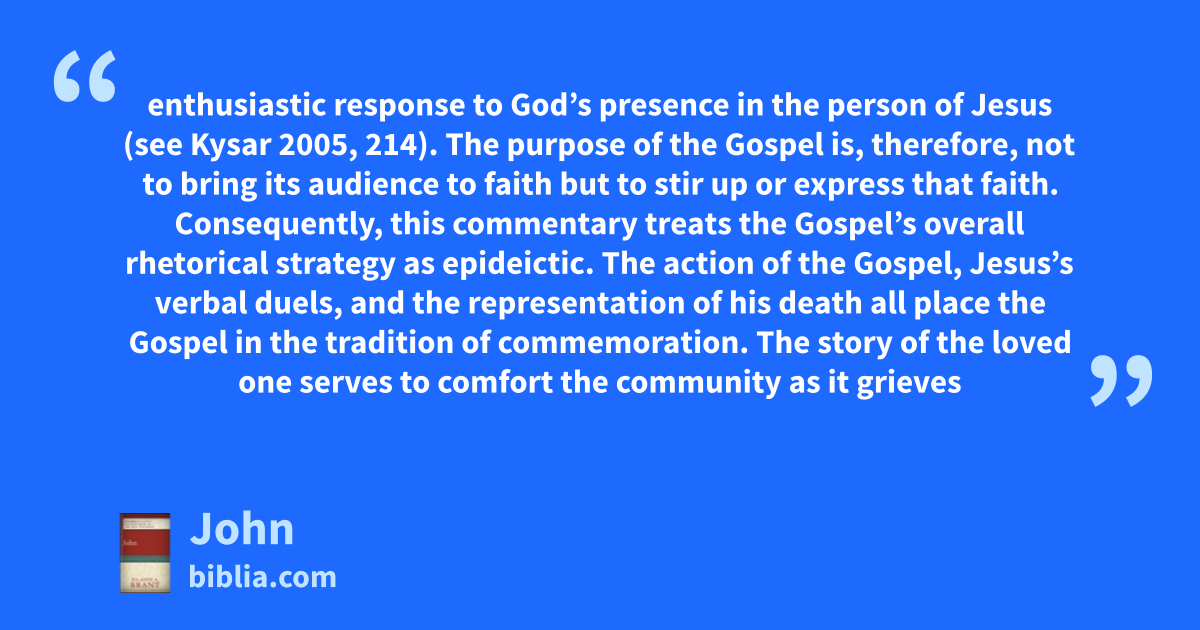 enthusiastic response to God’s presence in the person of Jesus (see Kysar 2005, 214). The purpose of the Gospel is, therefore, not to bring its audience to faith but to stir up or express that faith. Consequently, this commentary treats the Gospel’s overall rhetorical strategy as epideictic. The action of the Gospel, Jesus’s verbal duels, and the representation of his death all place the Gospel in the tradition of commemoration. The story of the loved one serves to comfort the community as it grieves