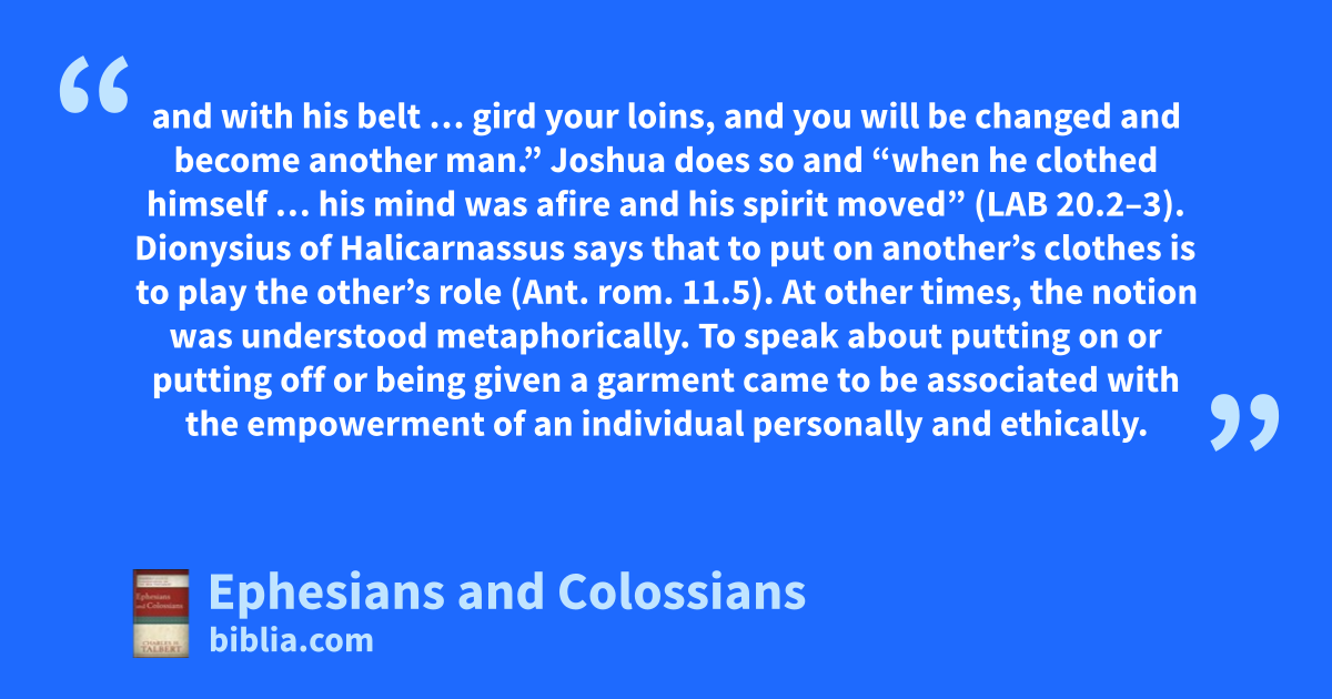 and with his belt … gird your loins, and you will be changed and become another man.” Joshua does so and “when he clothed himself … his mind was afire and his spirit moved” (LAB 20.2–3). Dionysius of Halicarnassus says that to put on another’s clothes is to play the other’s role (Ant. rom. 11.5). At other times, the notion was understood metaphorically. To speak about putting on or putting off or being given a garment came to be associated with the empowerment of an individual personally and ethically.