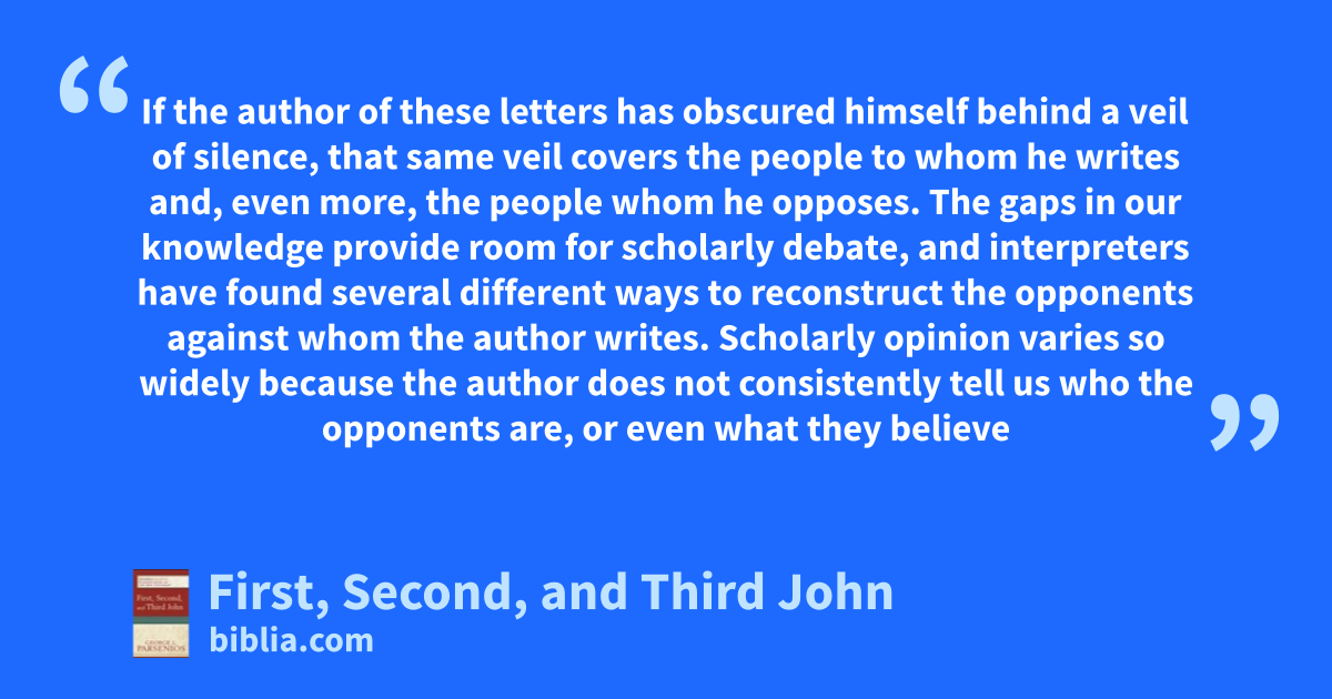 If the author of these letters has obscured himself behind a veil of silence, that same veil covers the people to whom he writes and, even more, the people whom he opposes. The gaps in our knowledge provide room for scholarly debate, and interpreters have found several different ways to reconstruct the opponents against whom the author writes. Scholarly opinion varies so widely because the author does not consistently tell us who the opponents are, or even what they believe