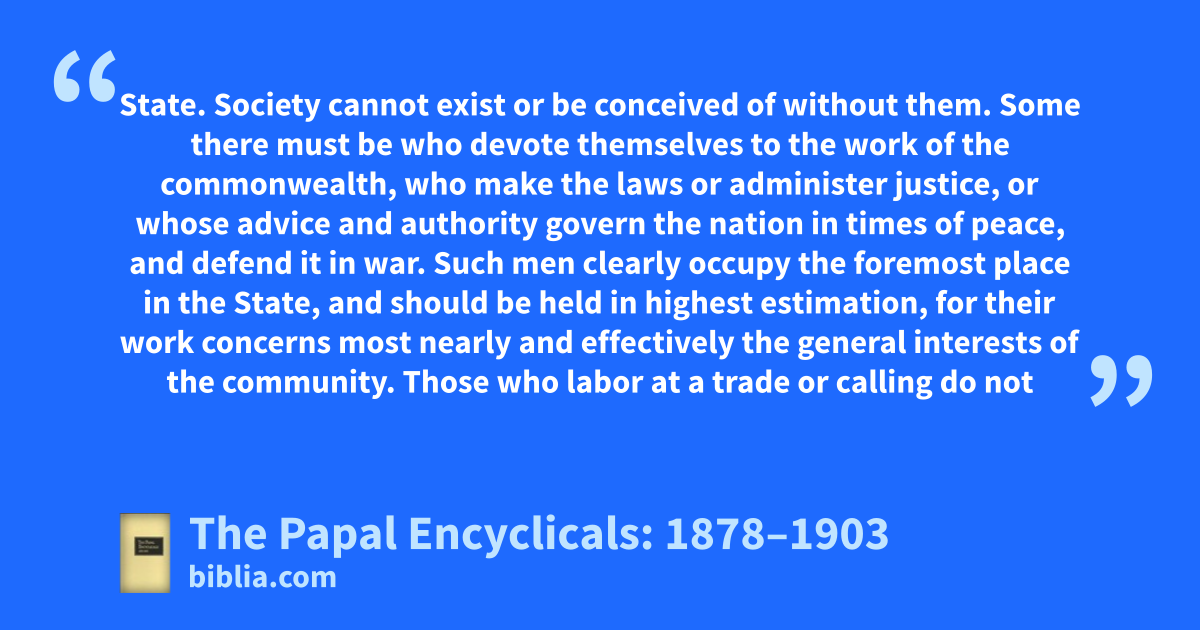 State. Society cannot exist or be conceived of without them. Some there must be who devote themselves to the work of the commonwealth, who make the laws or administer justice, or whose advice and authority govern the nation in times of peace, and defend it in war. Such men clearly occupy the foremost place in the State, and should be held in highest estimation, for their work concerns most nearly and effectively the general interests of the community. Those who labor at a trade or calling do not