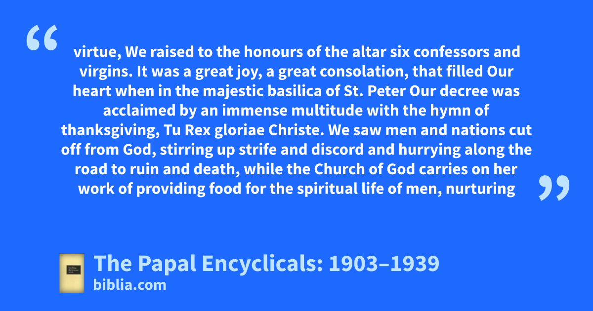 virtue, We raised to the honours of the altar six confessors and virgins. It was a great joy, a great consolation, that filled Our heart when in the majestic basilica of St. Peter Our decree was acclaimed by an immense multitude with the hymn of thanksgiving, Tu Rex gloriae Christe. We saw men and nations cut off from God, stirring up strife and discord and hurrying along the road to ruin and death, while the Church of God carries on her work of providing food for the spiritual life of men, nurturing