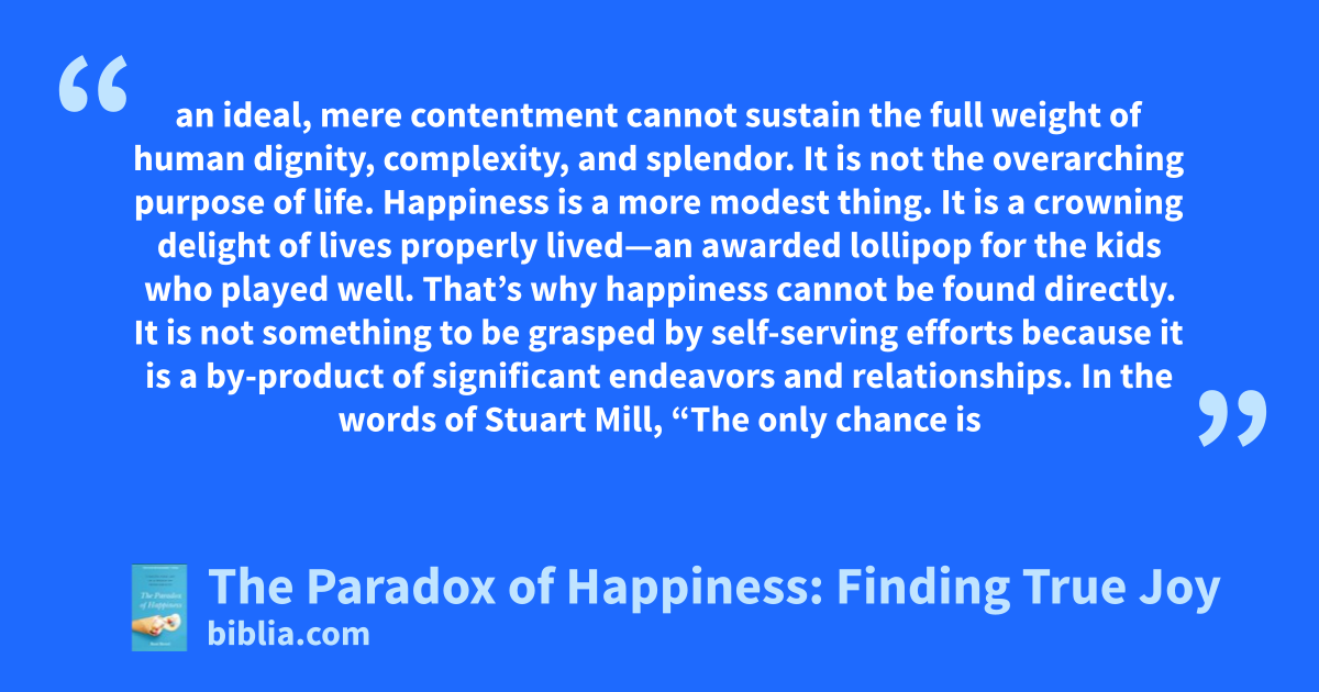 an ideal, mere contentment cannot sustain the full weight of human dignity, complexity, and splendor. It is not the overarching purpose of life. Happiness is a more modest thing. It is a crowning delight of lives properly lived—an awarded lollipop for the kids who played well. That’s why happiness cannot be found directly. It is not something to be grasped by self-serving efforts because it is a by-product of significant endeavors and relationships. In the words of Stuart Mill, “The only chance is