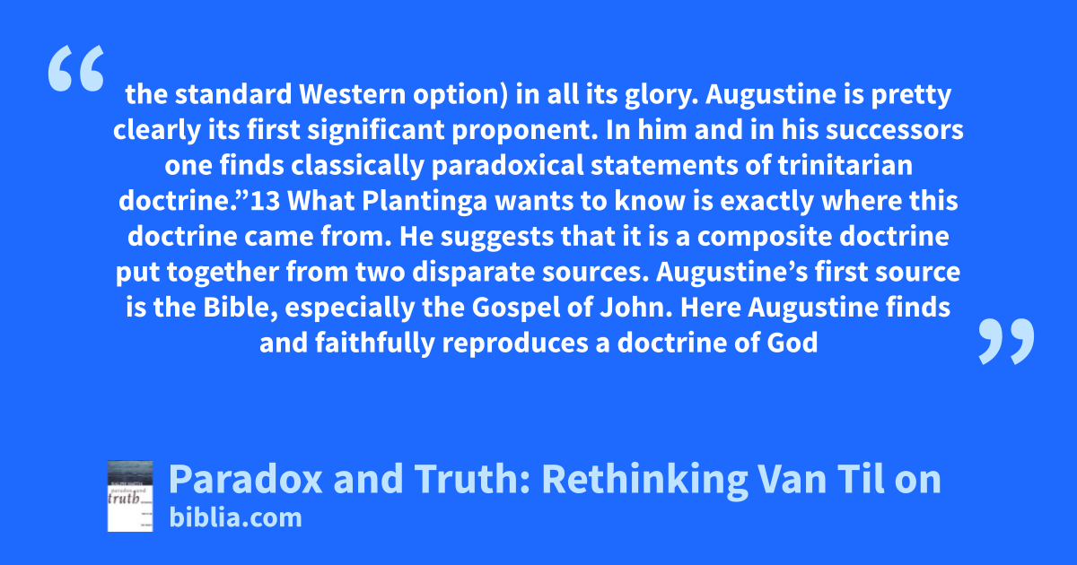 the standard Western option) in all its glory. Augustine is pretty clearly its first significant proponent. In him and in his successors one finds classically paradoxical statements of trinitarian doctrine.”13 What Plantinga wants to know is exactly where this doctrine came from. He suggests that it is a composite doctrine put together from two disparate sources. Augustine’s first source is the Bible, especially the Gospel of John. Here Augustine finds and faithfully reproduces a doctrine of God