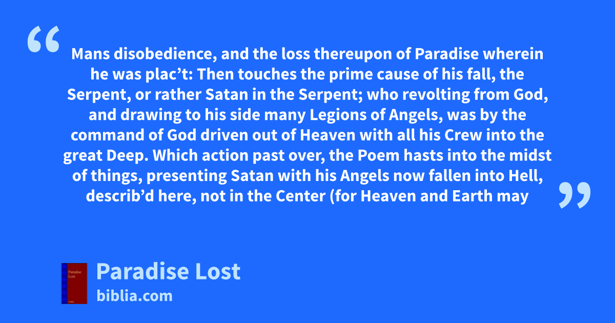 John Milton's epic poem, composed in 1667, detailing the creation and fall of man. Long considered a valuable literary treasure, Paradise Lost provides us with one man's picture of the fall of Satan, the creation of the earth and all its creatures, and the fall of man — all in the classic literary form of the epic poem.