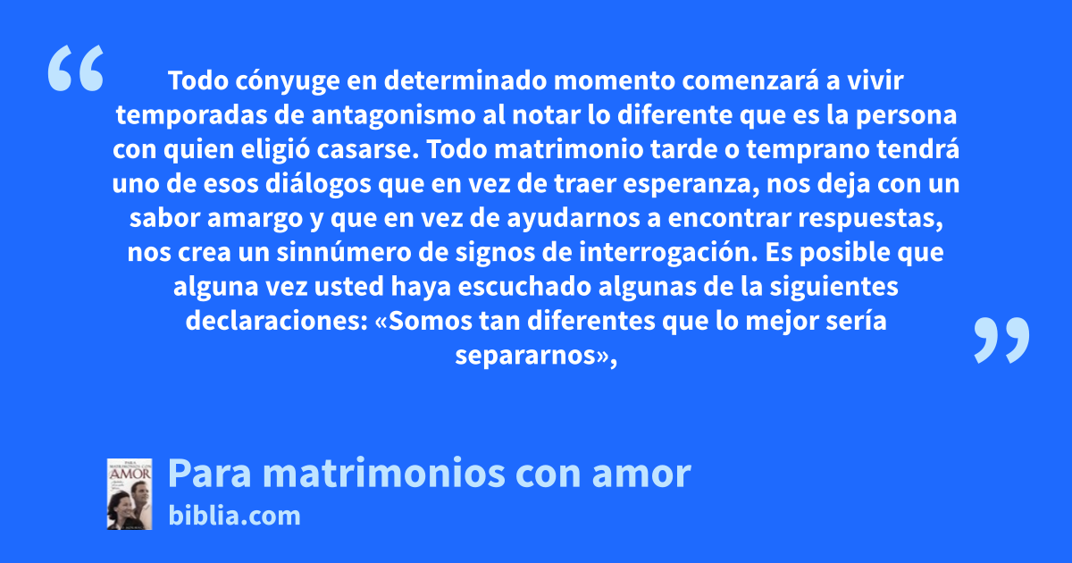 Hay momentos en que enfrentar la realidad es real mente difícil. Sin embargo, es mucho más lamentable y peligroso vivir tratando de ignorarla. Si usted ha elegido el matrimonio para poder vivir en el mundo de la fantasía, muy pronto terminará su fantasía o lo más lamentable, terminará su matrimonio. Todo cónyuge en determinado momento comenzará a vivir temporadas de antagonismo al notar lo...