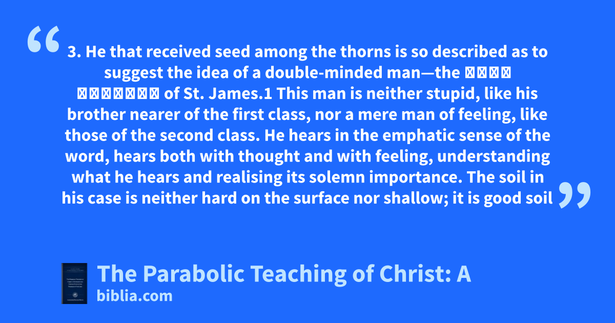 3. He that received seed among the thorns is so described as to suggest the idea of a double-minded man—the ἀνὴρ δίψυχος of St. James.1 This man is neither stupid, like his brother nearer of the first class, nor a mere man of feeling, like those of the second class. He hears in the emphatic sense of the word, hears both with thought and with feeling, understanding what he hears and realising its solemn importance. The soil in his case is neither hard on the surface nor shallow; it is good soil