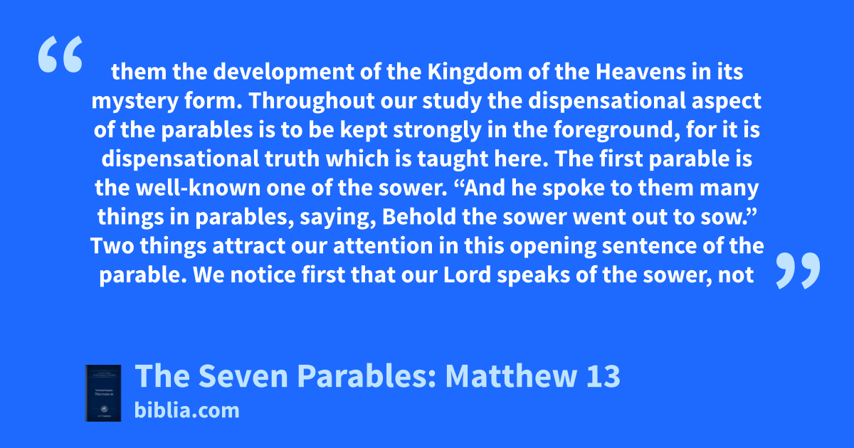 them the development of the Kingdom of the Heavens in its mystery form. Throughout our study the dispensational aspect of the parables is to be kept strongly in the foreground, for it is dispensational truth which is taught here. The first parable is the well-known one of the sower. “And he spoke to them many things in parables, saying, Behold the sower went out to sow.” Two things attract our attention in this opening sentence of the parable. We notice first that our Lord speaks of the sower, not