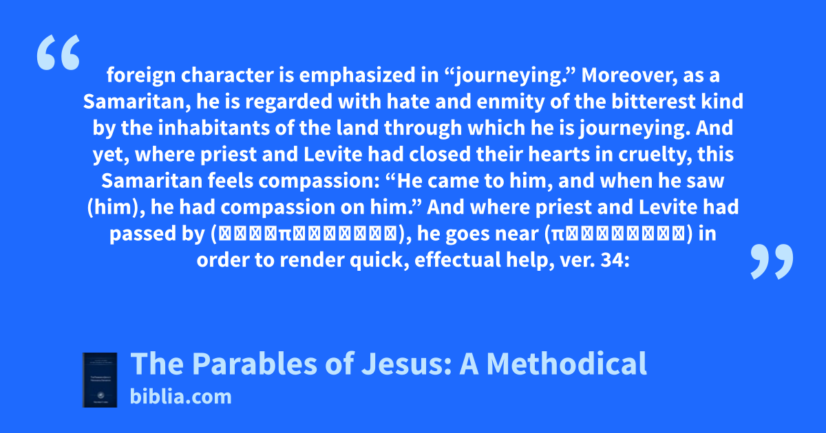 foreign character is emphasized in “journeying.” Moreover, as a Samaritan, he is regarded with hate and enmity of the bitterest kind by the inhabitants of the land through which he is journeying. And yet, where priest and Levite had closed their hearts in cruelty, this Samaritan feels compassion: “He came to him, and when he saw (him), he had compassion on him.” And where priest and Levite had passed by (ἀντιπαρῆλθεν), he goes near (προσελθών) in order to render quick, effectual help, ver. 34: