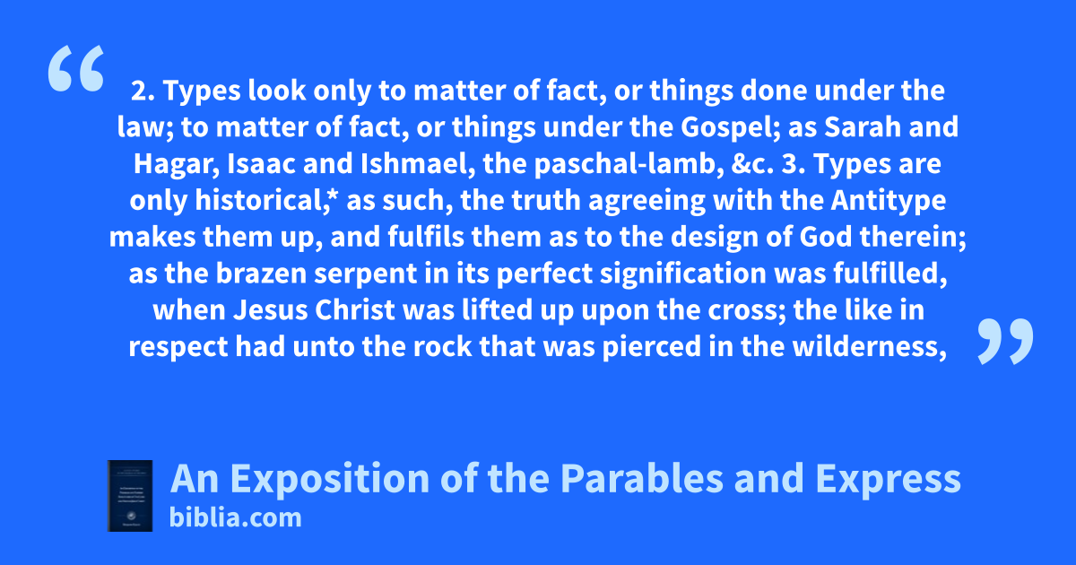 2. Types look only to matter of fact, or things done under the law; to matter of fact, or things under the Gospel; as Sarah and Hagar, Isaac and Ishmael, the paschal-lamb, &c. 3. Types are only historical,* as such, the truth agreeing with the Antitype makes them up, and fulfils them as to the design of God therein; as the brazen serpent in its perfect signification was fulfilled, when Jesus Christ was lifted up upon the cross; the like in respect had unto the rock that was pierced in the wilderness,