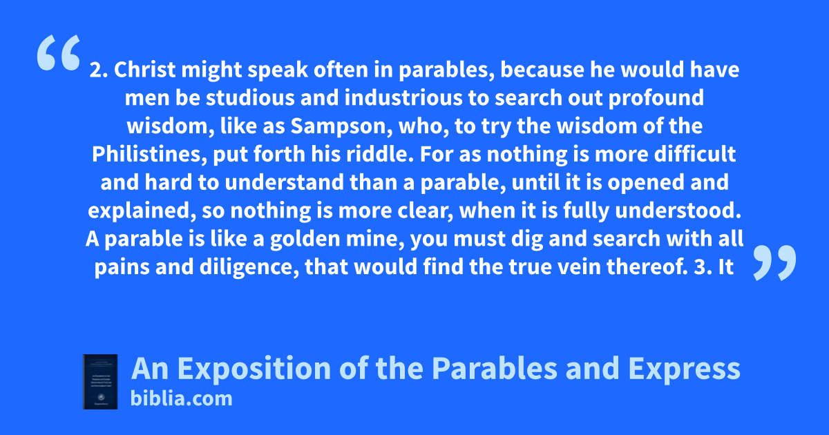 2. Christ might speak often in parables, because he would have men be studious and industrious to search out profound wisdom, like as Sampson, who, to try the wisdom of the Philistines, put forth his riddle. For as nothing is more difficult and hard to understand than a parable, until it is opened and explained, so nothing is more clear, when it is fully understood. A parable is like a golden mine, you must dig and search with all pains and diligence, that would find the true vein thereof. 3. It