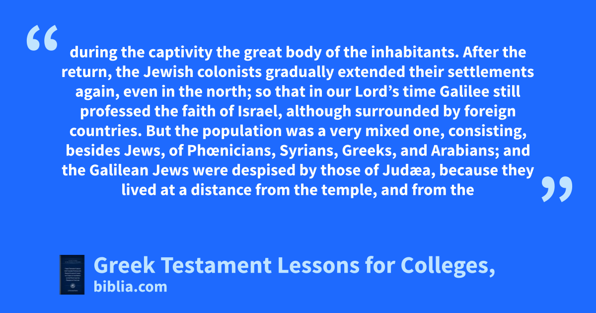 during the captivity the great body of the inhabitants. After the return, the Jewish colonists gradually extended their settlements again, even in the north; so that in our Lord’s time Galilee still professed the faith of Israel, although surrounded by foreign countries. But the population was a very mixed one, consisting, besides Jews, of Phœnicians, Syrians, Greeks, and Arabians; and the Galilean Jews were despised by those of Judæa, because they lived at a distance from the temple, and from the