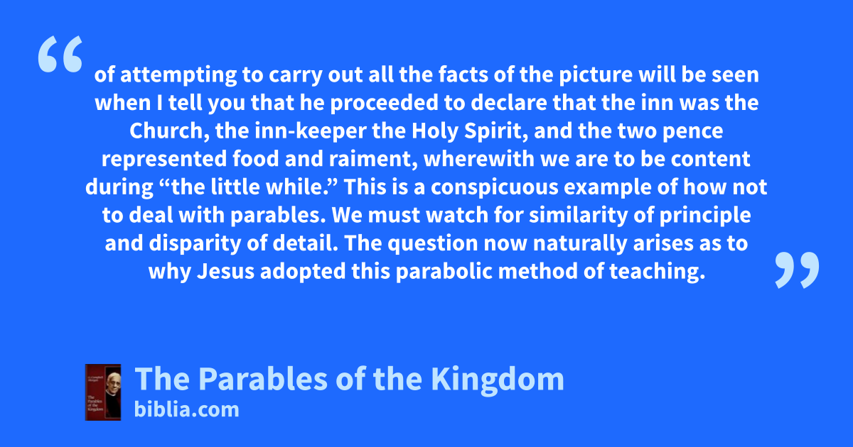of attempting to carry out all the facts of the picture will be seen when I tell you that he proceeded to declare that the inn was the Church, the inn-keeper the Holy Spirit, and the two pence represented food and raiment, wherewith we are to be content during “the little while.” This is a conspicuous example of how not to deal with parables. We must watch for similarity of principle and disparity of detail. The question now naturally arises as to why Jesus adopted this parabolic method of teaching.