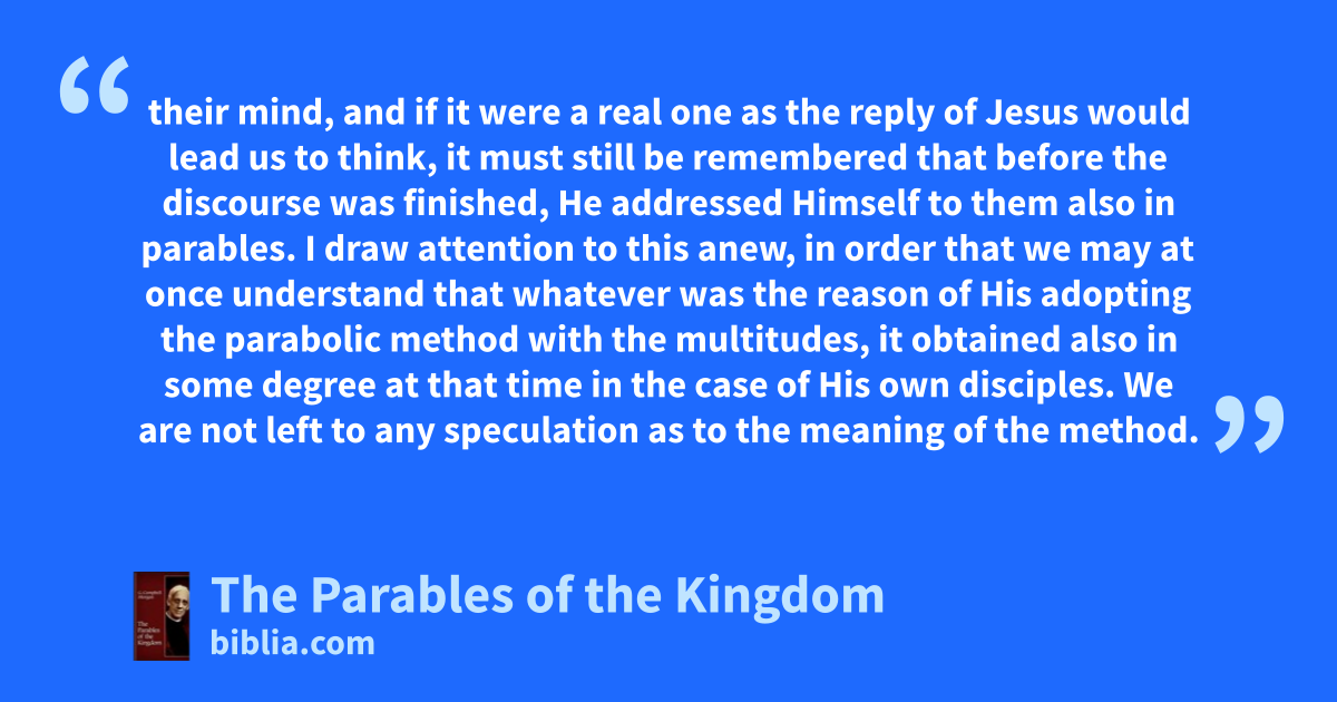 their mind, and if it were a real one as the reply of Jesus would lead us to think, it must still be remembered that before the discourse was finished, He addressed Himself to them also in parables. I draw attention to this anew, in order that we may at once understand that whatever was the reason of His adopting the parabolic method with the multitudes, it obtained also in some degree at that time in the case of His own disciples. We are not left to any speculation as to the meaning of the method.