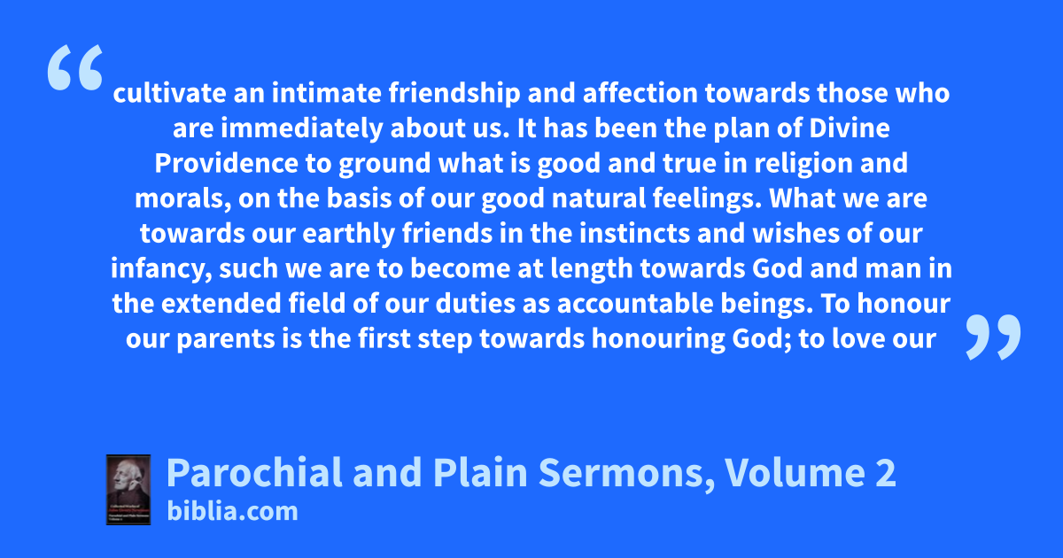 cultivate an intimate friendship and affection towards those who are immediately about us. It has been the plan of Divine Providence to ground what is good and true in religion and morals, on the basis of our good natural feelings. What we are towards our earthly friends in the instincts and wishes of our infancy, such we are to become at length towards God and man in the extended field of our duties as accountable beings. To honour our parents is the first step towards honouring God; to love our