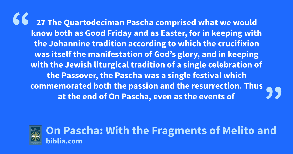 27 The Quartodeciman Pascha comprised what we would know both as Good Friday and as Easter, for in keeping with the Johannine tradition according to which the crucifixion was itself the manifestation of God’s glory, and in keeping with the Jewish liturgical tradition of a single celebration of the Passover, the Pascha was a single festival which commemorated both the passion and the resurrection. Thus at the end of On Pascha, even as the events of