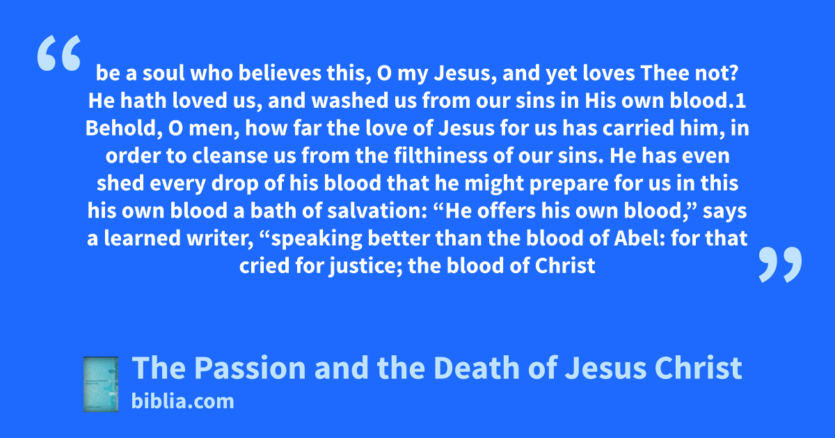 be a soul who believes this, O my Jesus, and yet loves Thee not? He hath loved us, and washed us from our sins in His own blood.1 Behold, O men, how far the love of Jesus for us has carried him, in order to cleanse us from the filthiness of our sins. He has even shed every drop of his blood that he might prepare for us in this his own blood a bath of salvation: “He offers his own blood,” says a learned writer, “speaking better than the blood of Abel: for that cried for justice; the blood of Christ