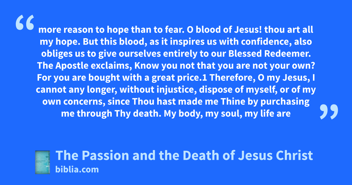 more reason to hope than to fear. O blood of Jesus! thou art all my hope. But this blood, as it inspires us with confidence, also obliges us to give ourselves entirely to our Blessed Redeemer. The Apostle exclaims, Know you not that you are not your own? For you are bought with a great price.1 Therefore, O my Jesus, I cannot any longer, without injustice, dispose of myself, or of my own concerns, since Thou hast made me Thine by purchasing me through Thy death. My body, my soul, my life are